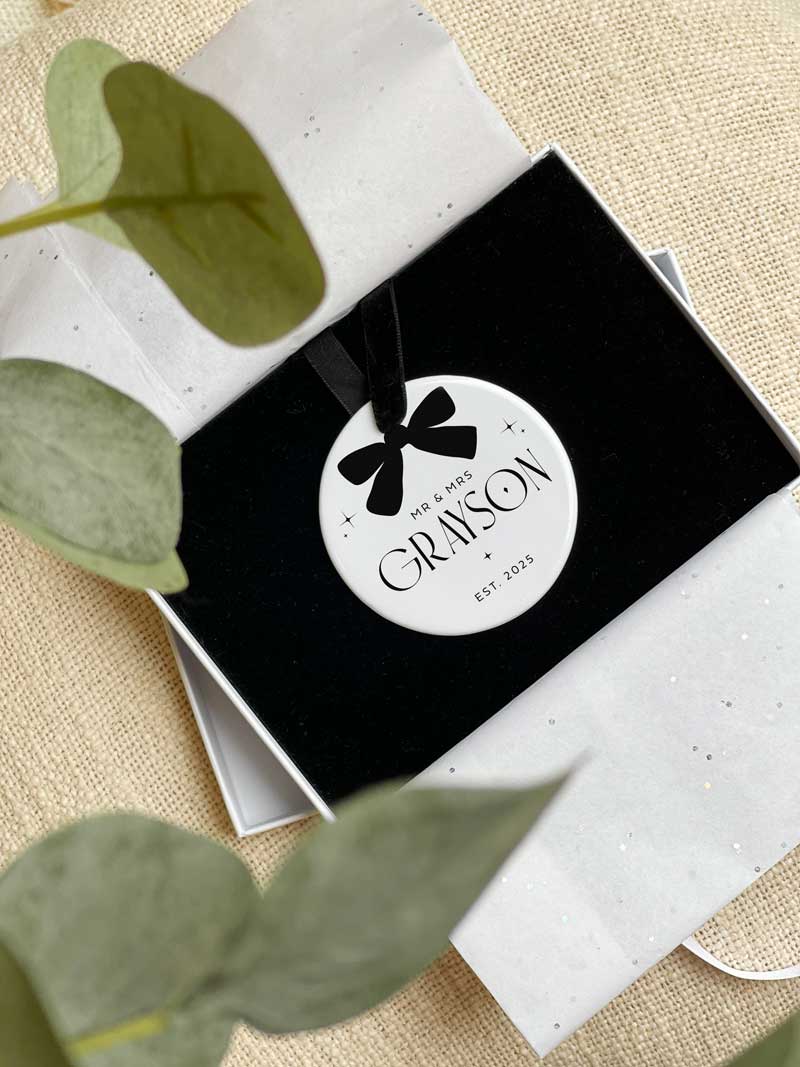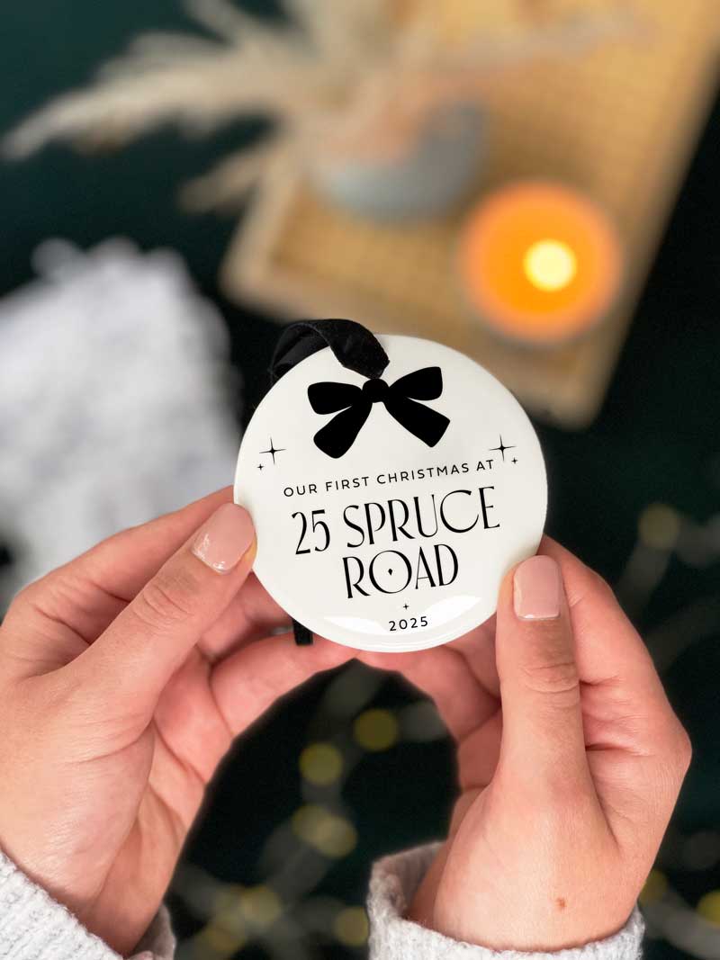 Personalised with your custom name and date, these glossy ceramic baubles are the perfect Christmas keepsake to celebrate milestones in 2025. Printed in our UK studio and finished with a hand tied black velvet ribbon for hanging on your Christmas tree, years after year. 🎄