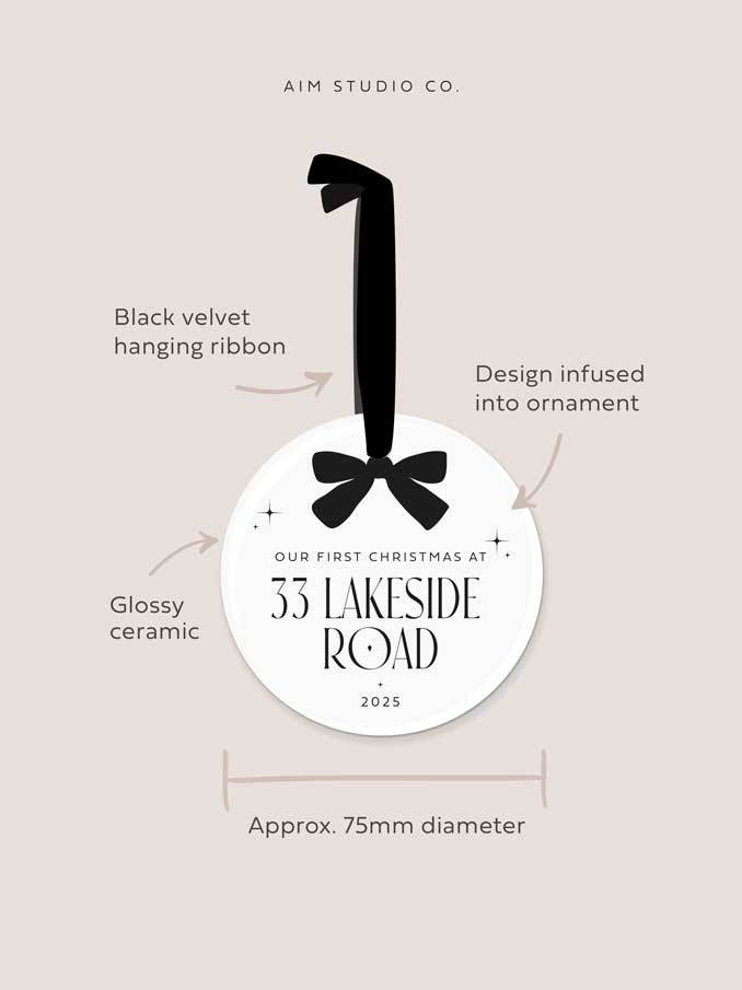 Each bauble is printed with modern typography and an elegant black bow detail. Add your personalised house name and/or number for a truly one-of-a-kind bauble for your Christmas tree.