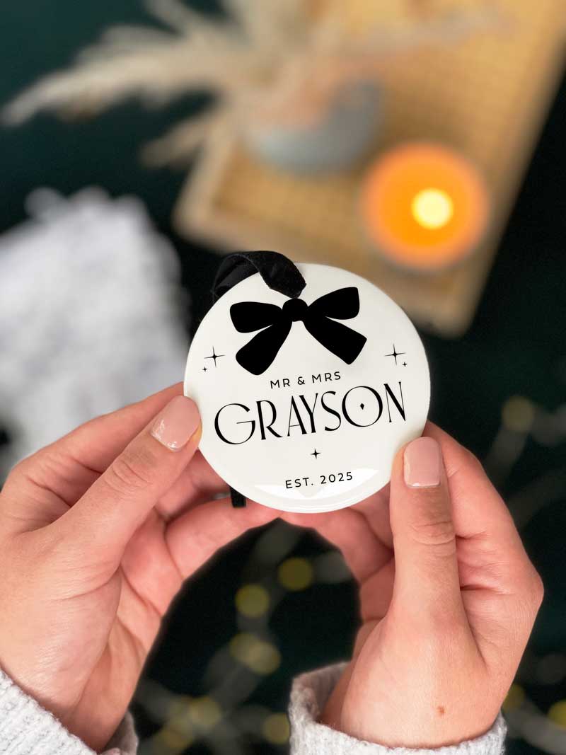 Each ceramic decoration is printed in rich black ink with Mr & Mrs (or Mr & Mr/ Mrs & Mrs), your custom married name and 2025. Surrounded by delicate star details and a classic black bow, this modern yet timeless bauble is sure to stand out on your Christmas tree.
