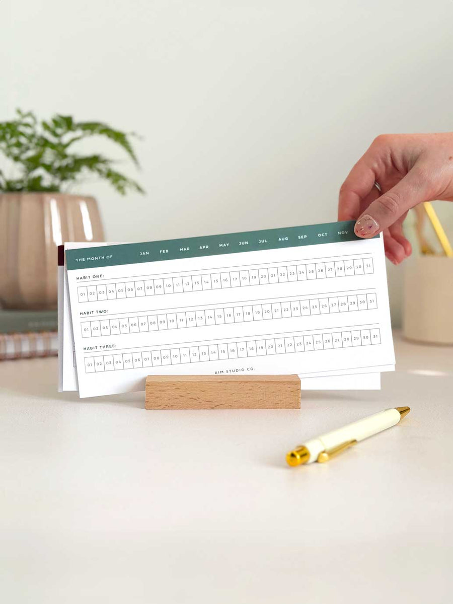 woman writing a list on a slim to do list pad with aesthetic gold pen at an office desk